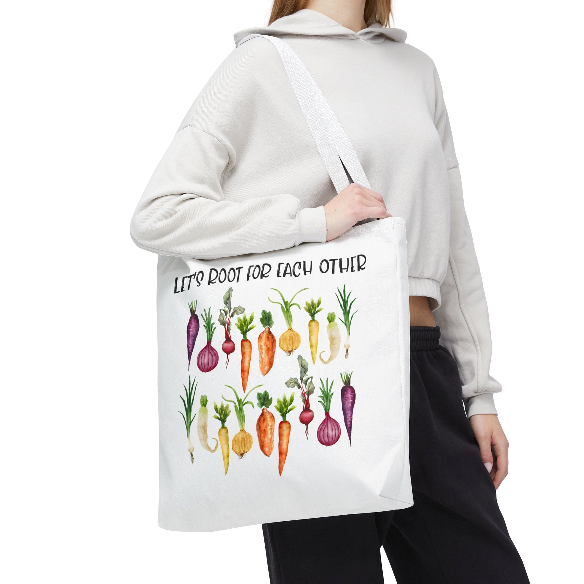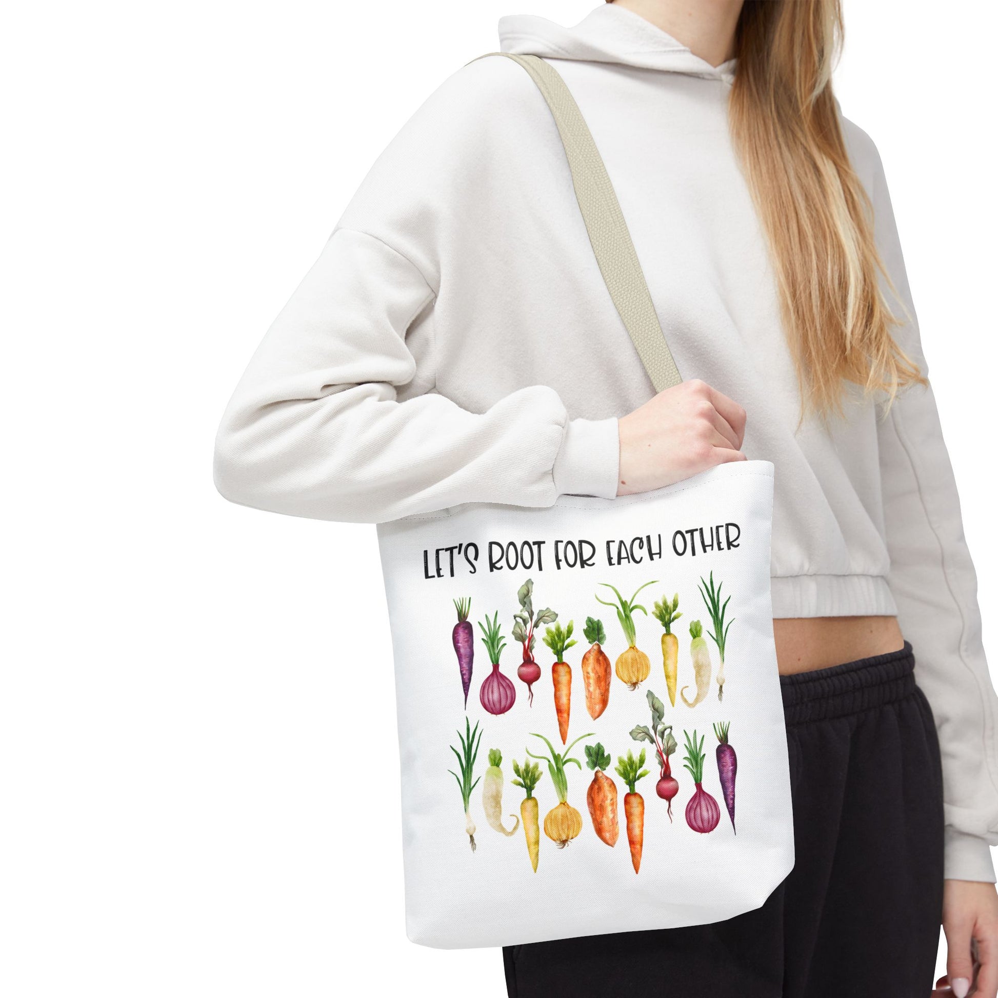 Carry kindness wherever you go with our “Let’s Root for Each Other” tote bag! Adorned with a charming array of rooted vegetables—like beets, carrots, radishes, and onions—this bag is as heartwarming as it is practical. The playful pun paired with vibrant veggie illustrations makes it a perfect reminder to lift each other up and stay grounded.