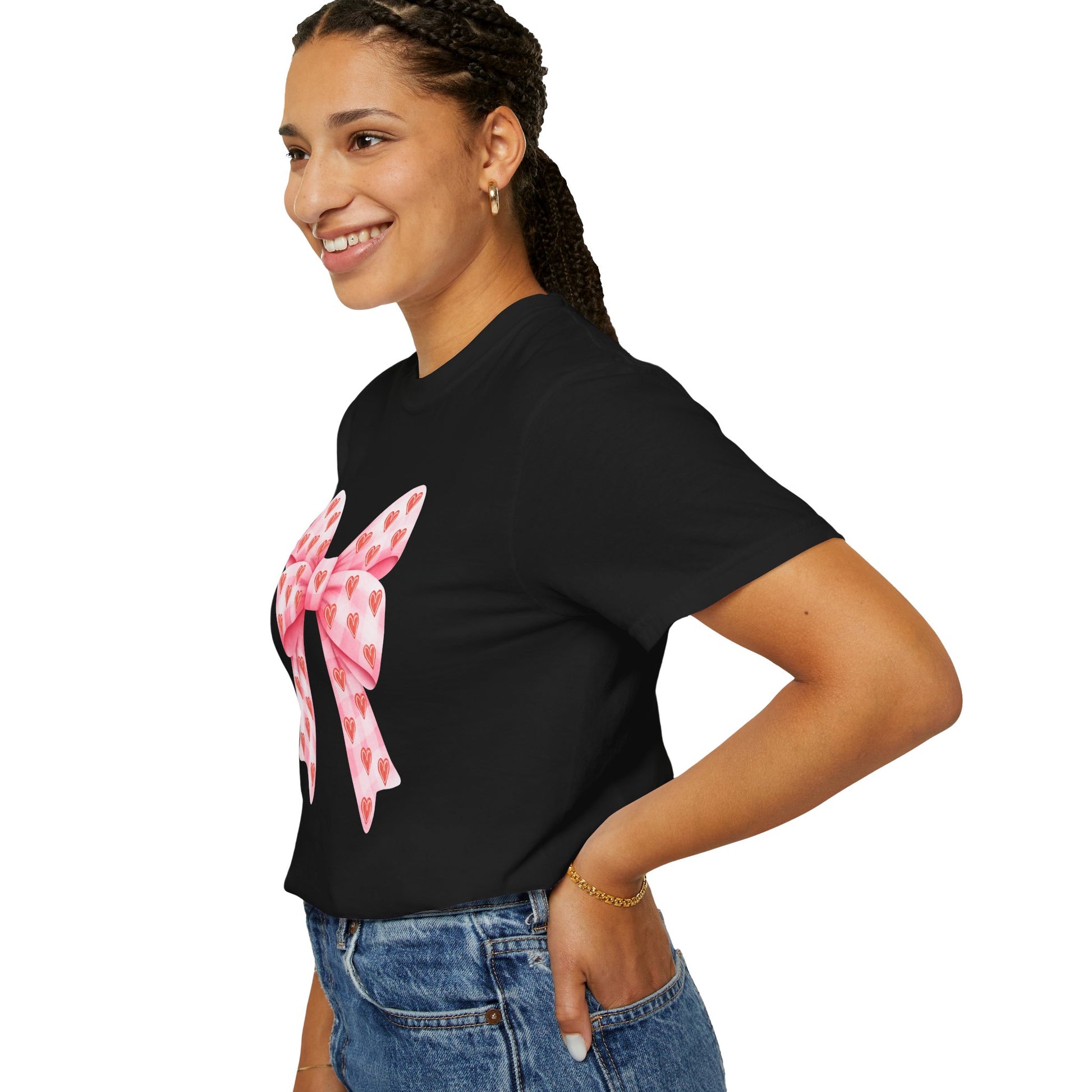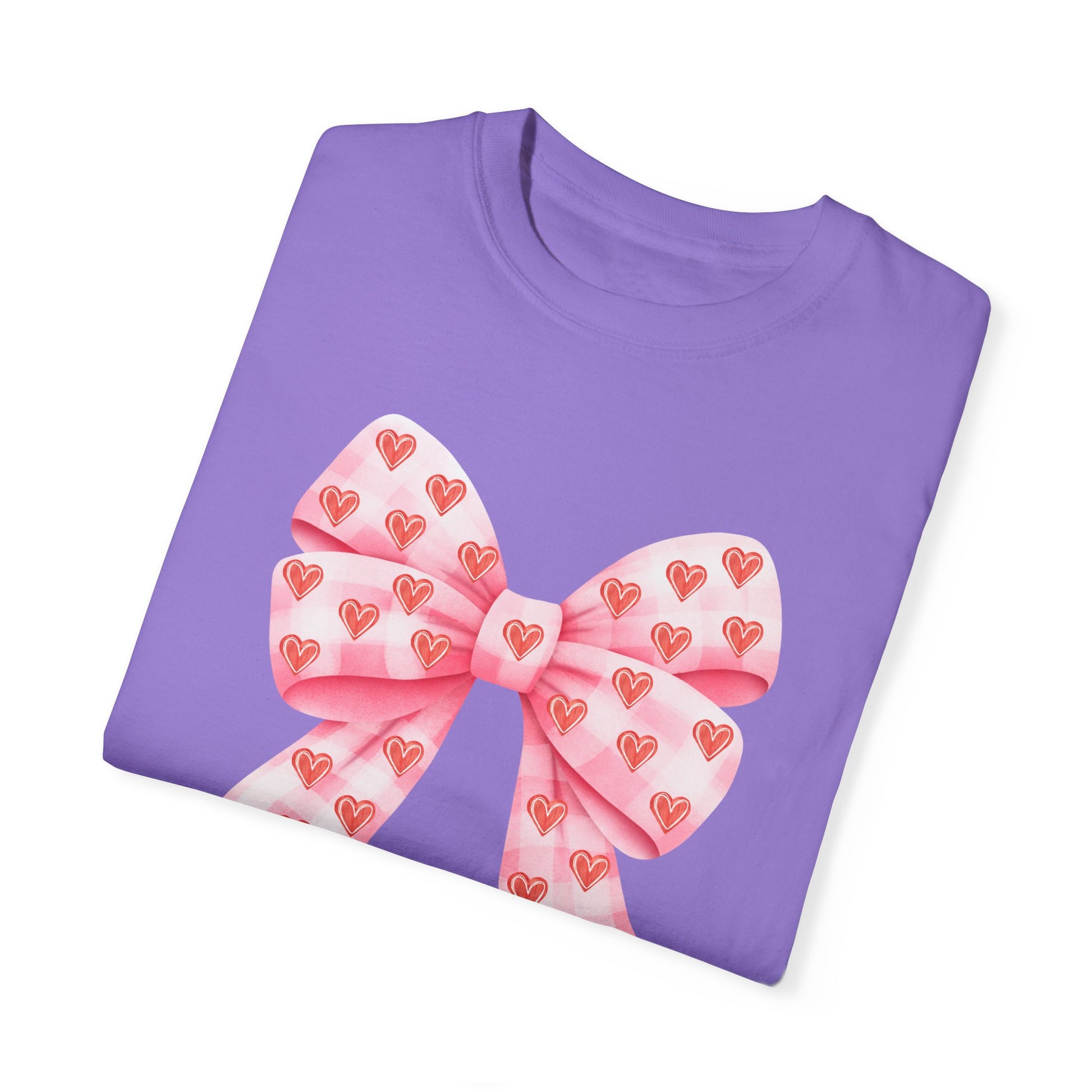 Embrace your sweet side with this charming shirt featuring a pink bow with hearts. Designed to add a playful, romantic touch to your wardrobe, this shirt combines style and comfort in the most delightful way. Perfect for Valentine's Day or any day you want to show off your fun, coquette style.