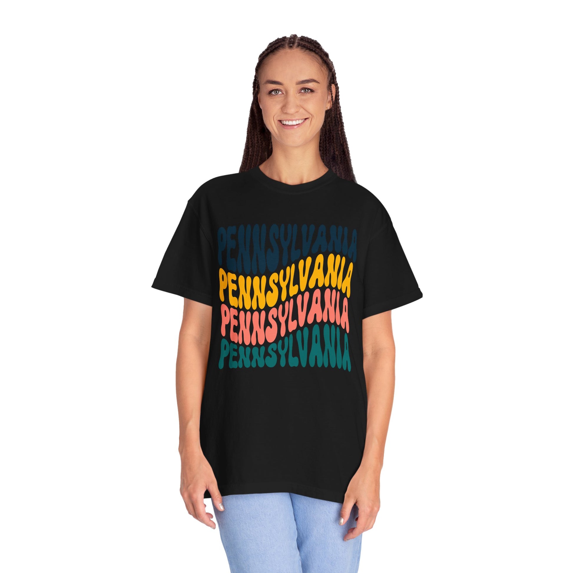Bring the retro vibes to life with this eye-catching Pennsylvania Shirt. The design features a wavy, groovy font style that instantly channels a fun, vintage energy! Bold pastel colors give the shirt a laid-back, yet vibrant look - perfect for anyone who loves a pop of color and a throwback aesthetic!